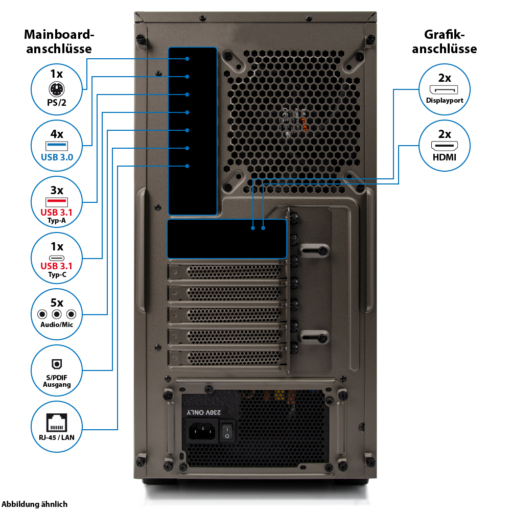 | USB-Schnittstellen (Rückseite) | 4x USB 3.0 Typ-A, 3x USB 3.1 Typ-A, 1x USB 3.1 Typ-C |