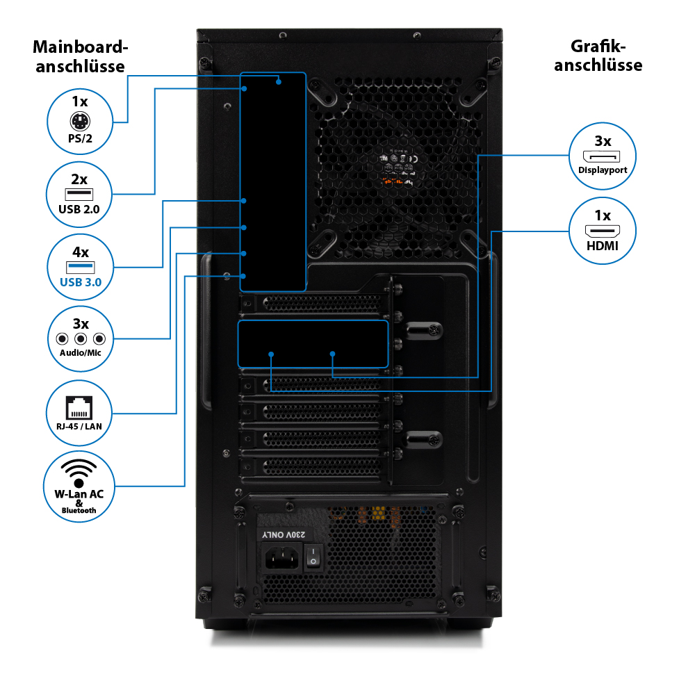 Für Ihre Hardware wie Monitor, Maus, Tastatur, Drucker, externe Festplatten etc. steht eine reichhaltige Auswahl aktueller Schnittstellen zur Verfügung.