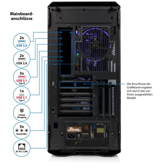 | USB-Schnittstellen (Rückseite) | 2x USB 2.0 Typ-A, 2x USB 3.0 Typ-A, 3x USB 3.1 Typ-A, 1x USB 3.1 Typ-C |