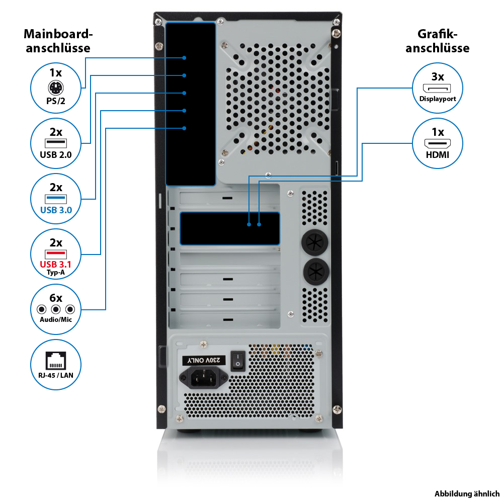 | USB-Schnittstellen (Rückseite) | 2x USB 2.0 Typ-A, 2x USB 3.0 Typ-A, 2x USB 3.1 Typ-A |